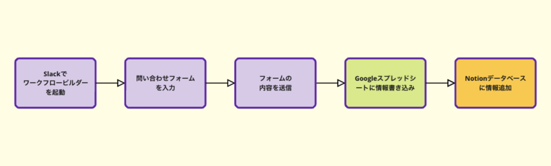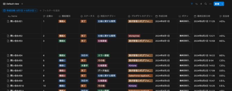 簡易的な図ではありますが、このような流れを踏んで以下のように問い合わせ一覧をNotionに表示させています。