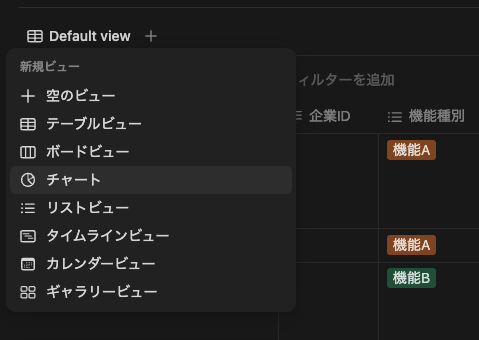 データベースのDefault viewから「+」ボタンをクリックし、「チャート」を選択