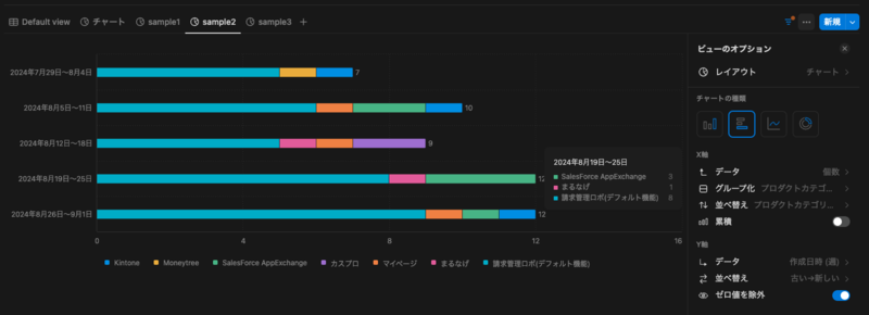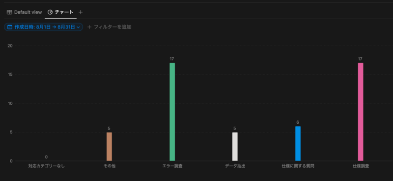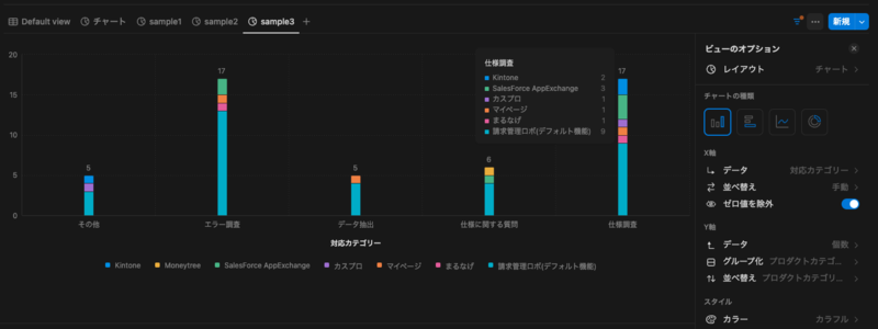 - エラー調査やデータ抽出といった対応カテゴリーの合計件数の表示だけでなく、さらにその中で各プロダクトカテゴリがどのくらいの件数となっているのかを可視化できます
