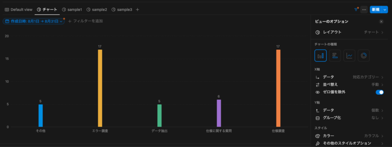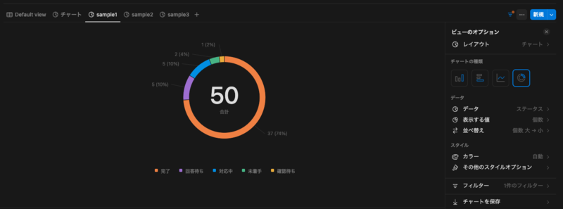 - Notion内で問い合わせチケットやタスクに対してデータベース管理をしながらカスタマイズしたチャートを作成でき、外部ツールを使用しなくてもデータ入力から可視化までのワークフローが完結する
